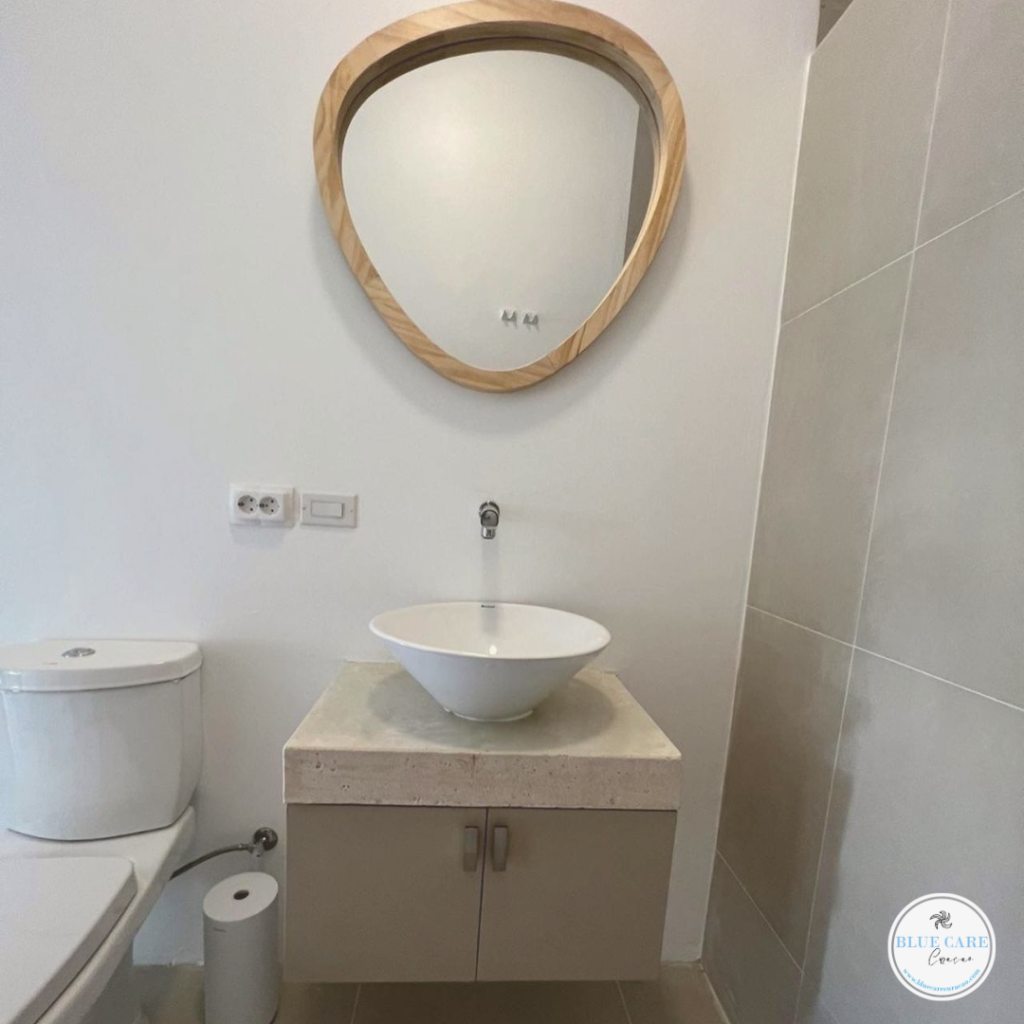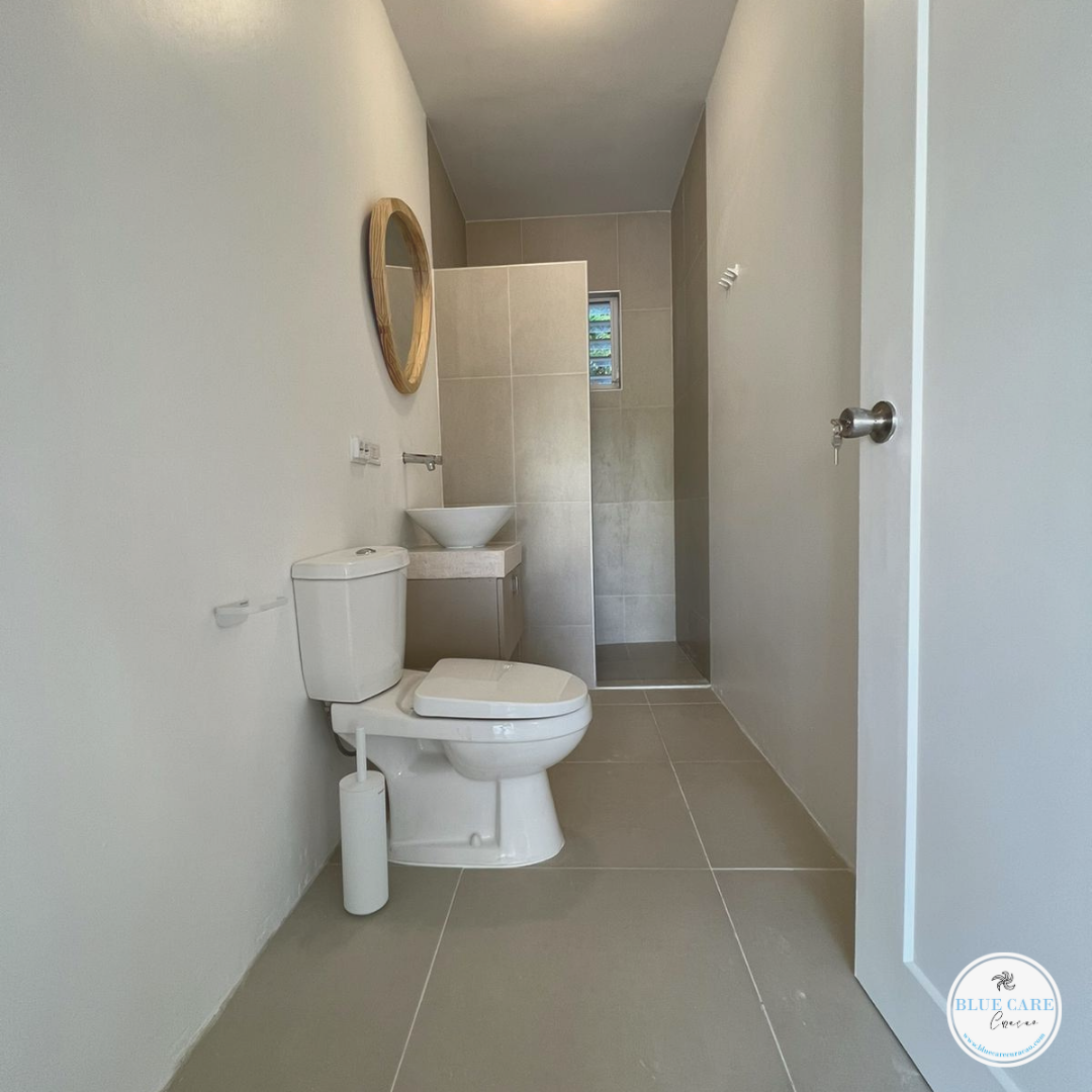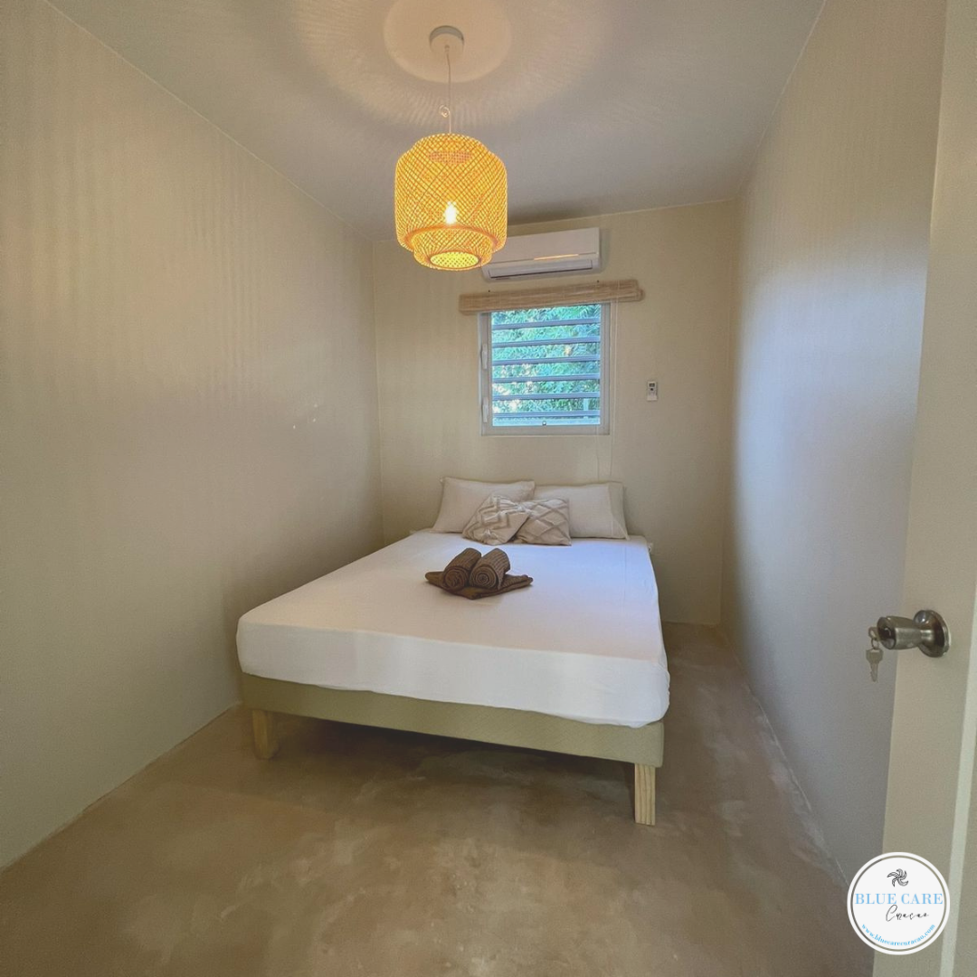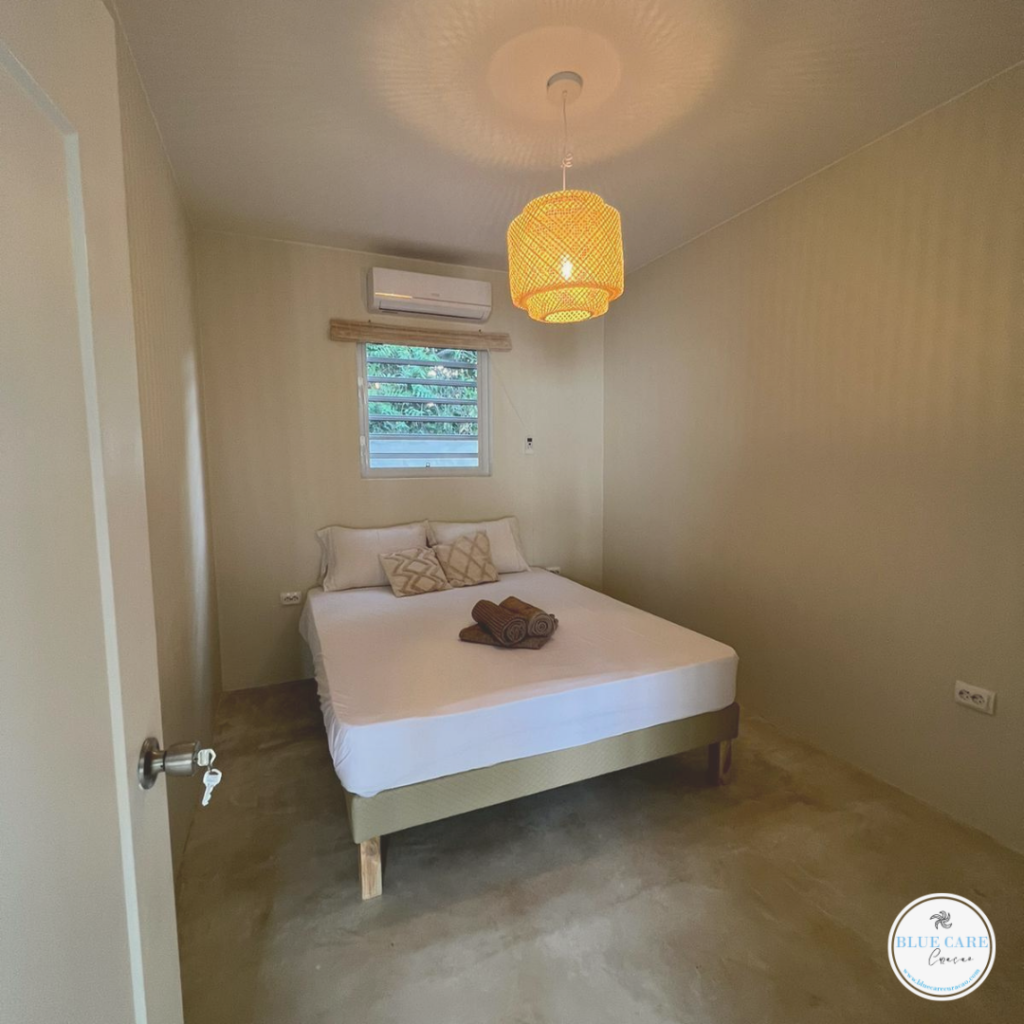 Er zijn twee slaapkamers welke beide voorzien zijn van een tweepersoonsbed, een kledingkast, een airco en de ramen zijn voorzien van horren. De badkamer heeft een inloopdouche met warm water, wastafel met wandmeubel en een toilet.