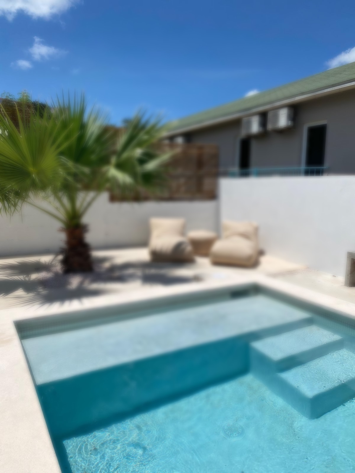Je rijdt door een automatische hek naar het appartement waar voldoende plek is om je auto te kunnen parkeren. Via de gemeenschappelijke, tropische tuin met een gedeeld zwembad, kom je bij jullie grote Porch.