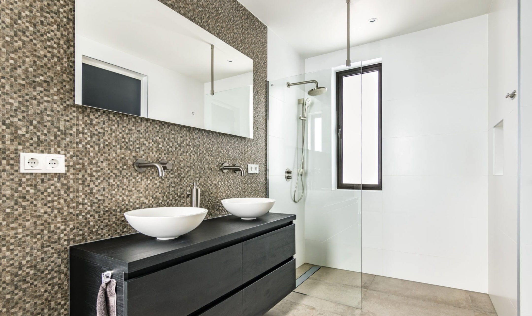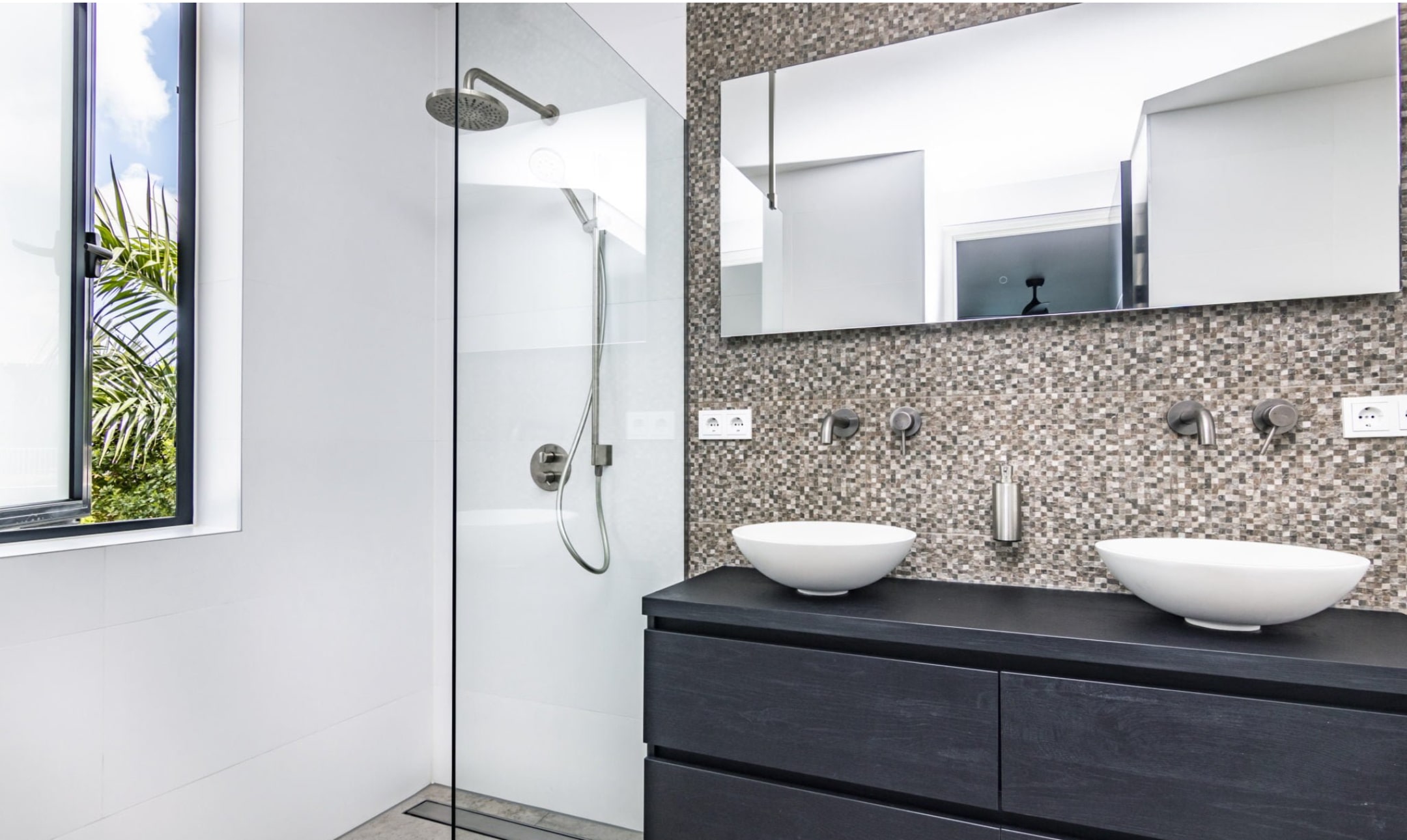 De master bedroom is ruim van opzet en heeft een en-suite badkamer. Deze badkamer is ingericht met een ruime inloopdouche, dubbele wastafel en een