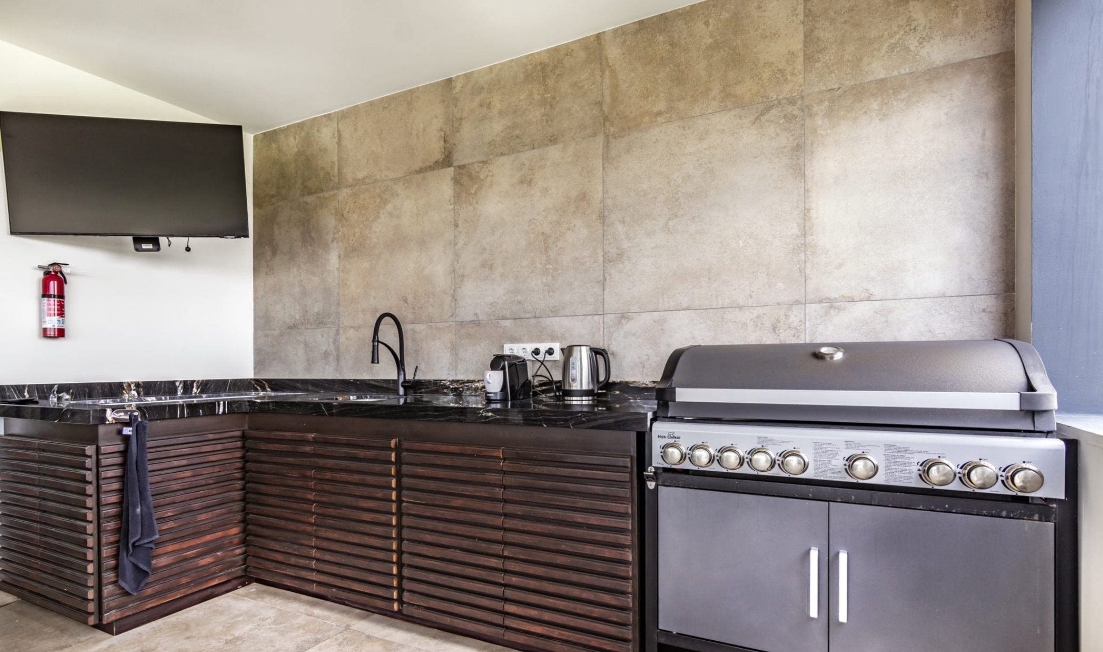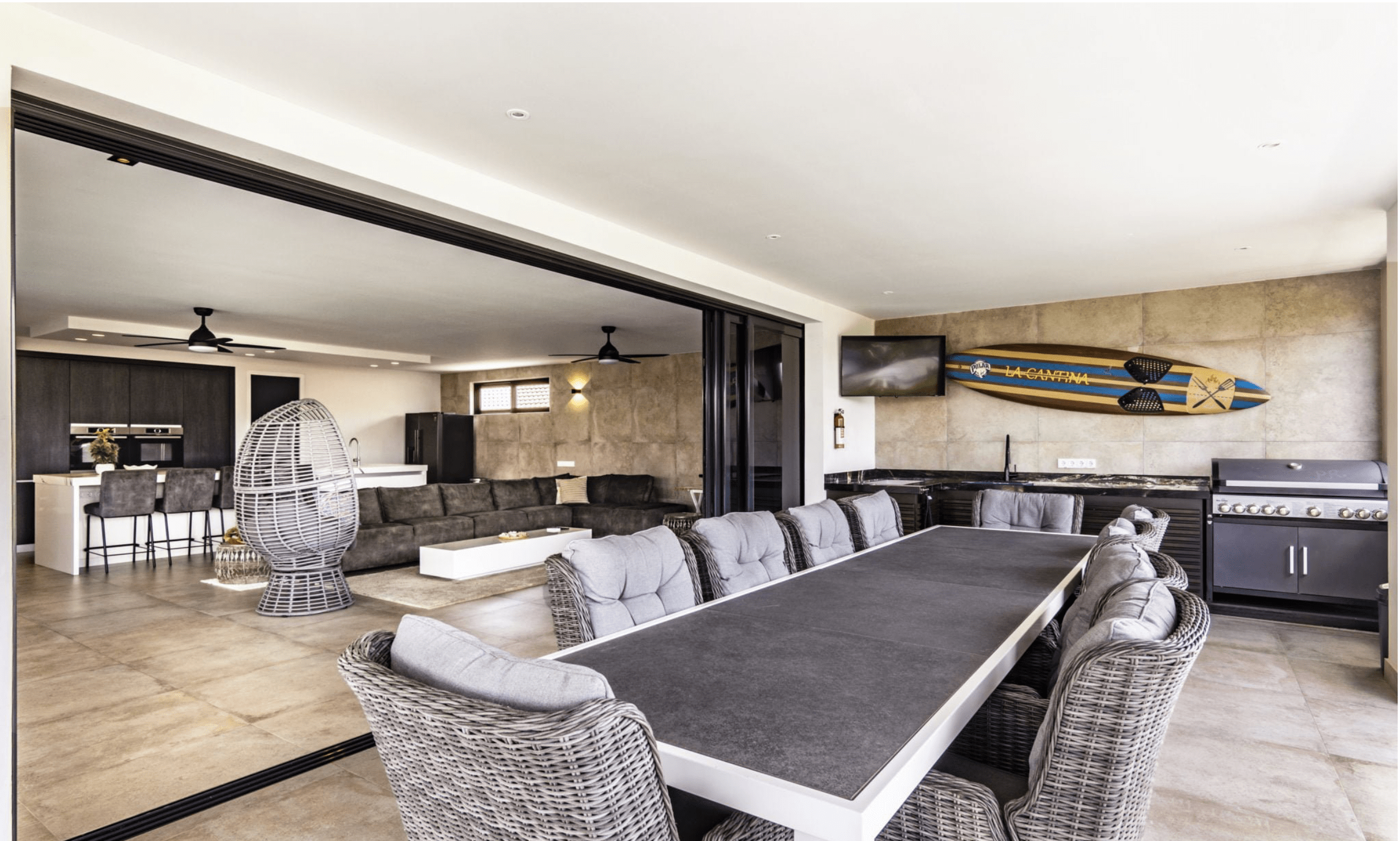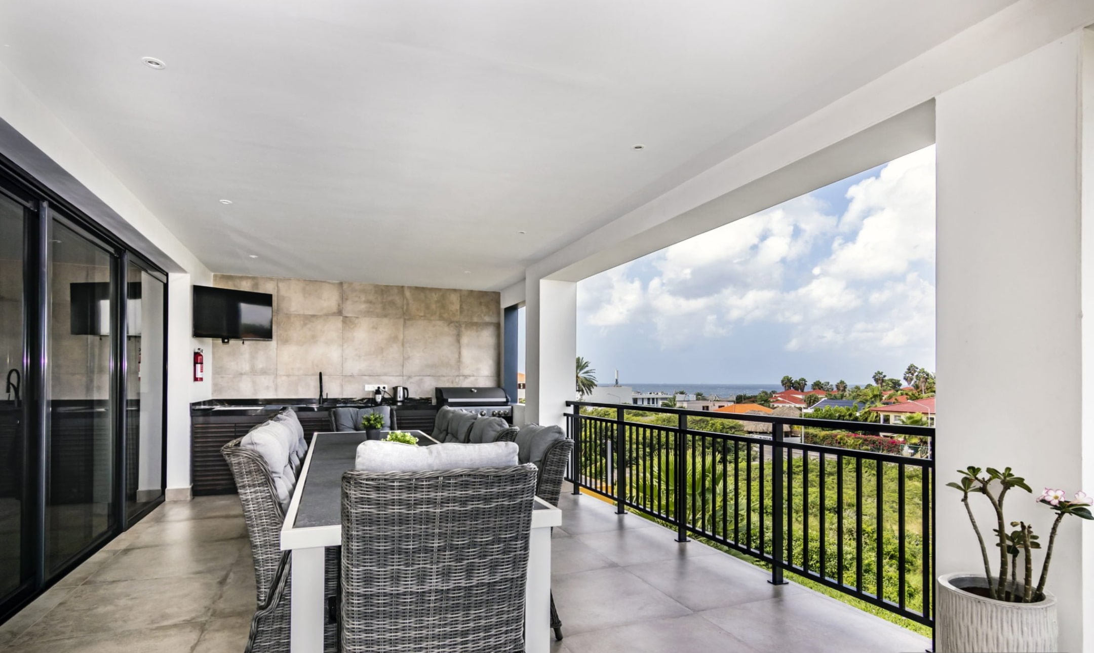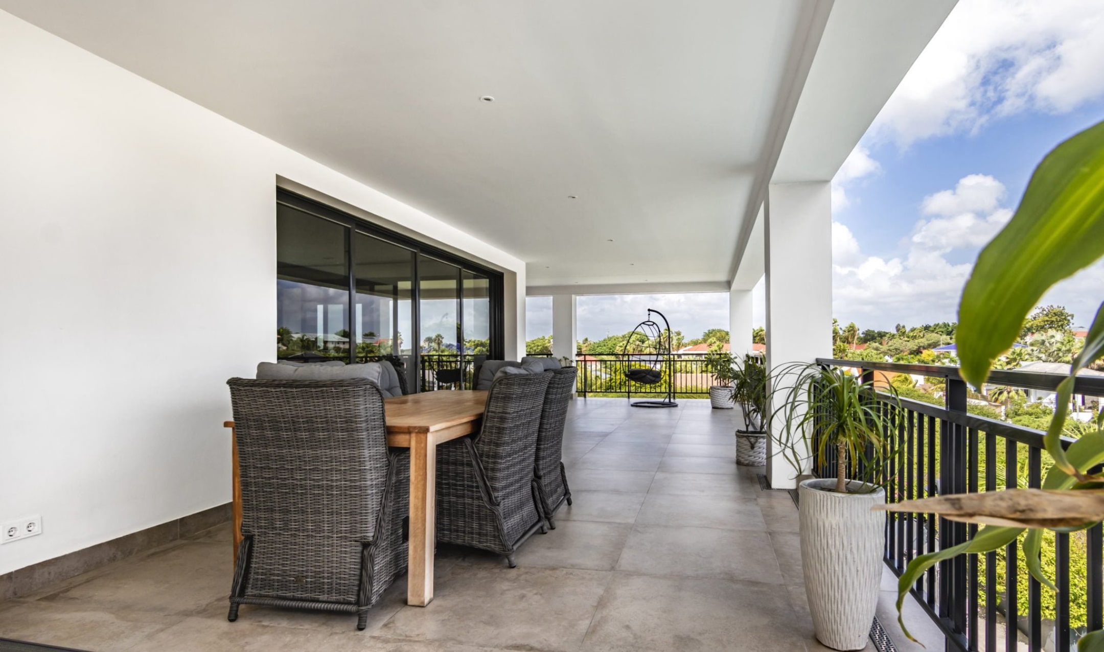 De schuifpui verbindt de woonkamer met een ruime overdekte porch die tevens voorzien is van een buitenkeuken met spoelbak en een BBQ. Vanaf de porch is er uitzicht op zee.
