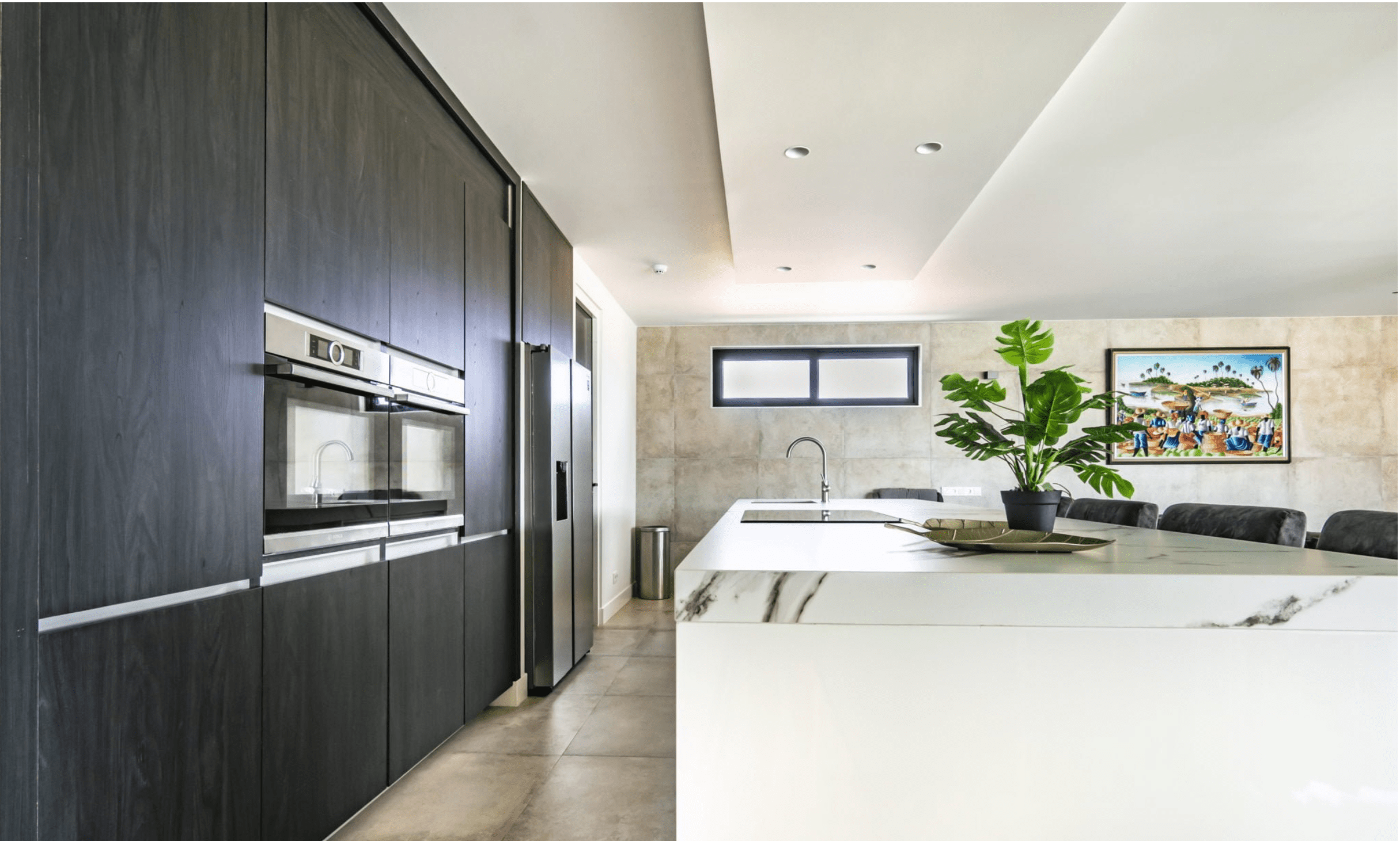 De keuken is luxe afgewerkt en van alle gemakken voorzien. Het eiland heeft een granieten werkblad waarin de spoelbak en het fornuis zijn weggewerkt. De ruime mat zwarte kastenwand biedt veel bergruimte en beschikt verder over een ingebouwde oven en magnetron. Er is een Amerikaanse koelvries combinatie aanwezig. Achter de keuken bevindt zich een ruime pantry met de was machine aansluiting.