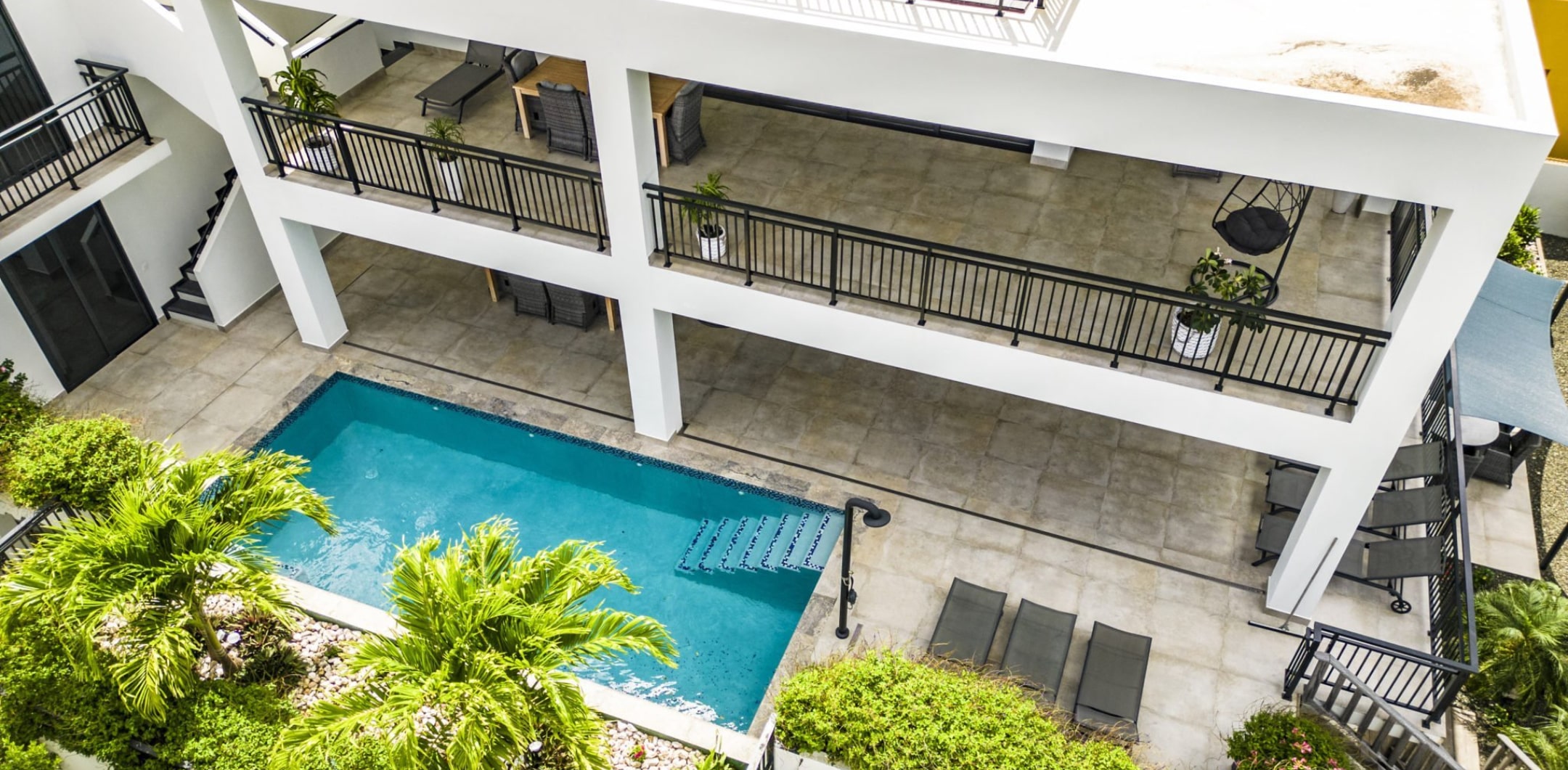 De hal geeft via de trap toegang tot een identieke woonruimte op de verdieping. De verdiepingen zijn zelfstandig van elkaar te gebruiken en beschikken elk over maar liefst 4 slaapkamers en 3,5 badkamer. Vanaf de verdieping is het zwembad door middel van een vaste trap te bereiken.